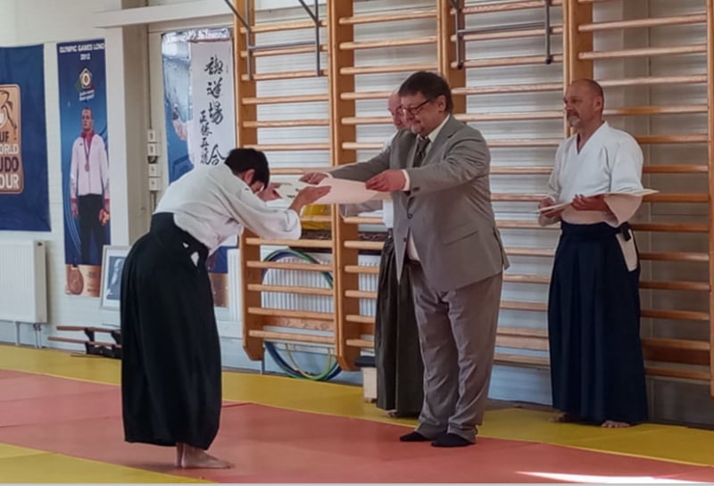 Valamint ünnepélyes keretek között átadásra került Becze Zsolt (Misogi Aiki Dojo) számára az Aikikai 5. dan díszes oklevele is!